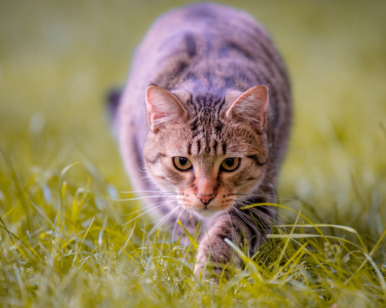 Серая кошка крадется по зеленой траве Обои для рабочего стола 1280x1024