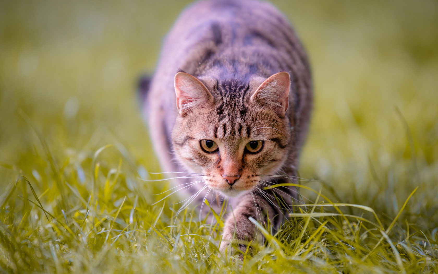 Серая кошка крадется по зеленой траве Обои для рабочего стола 1680x1050