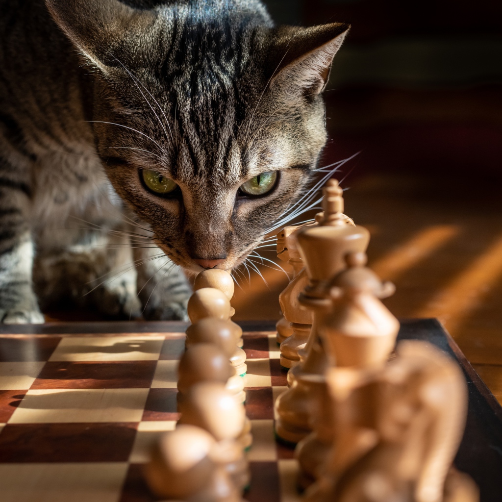 Серый кот нюхает шахматы Обои для рабочего стола 1024x1024