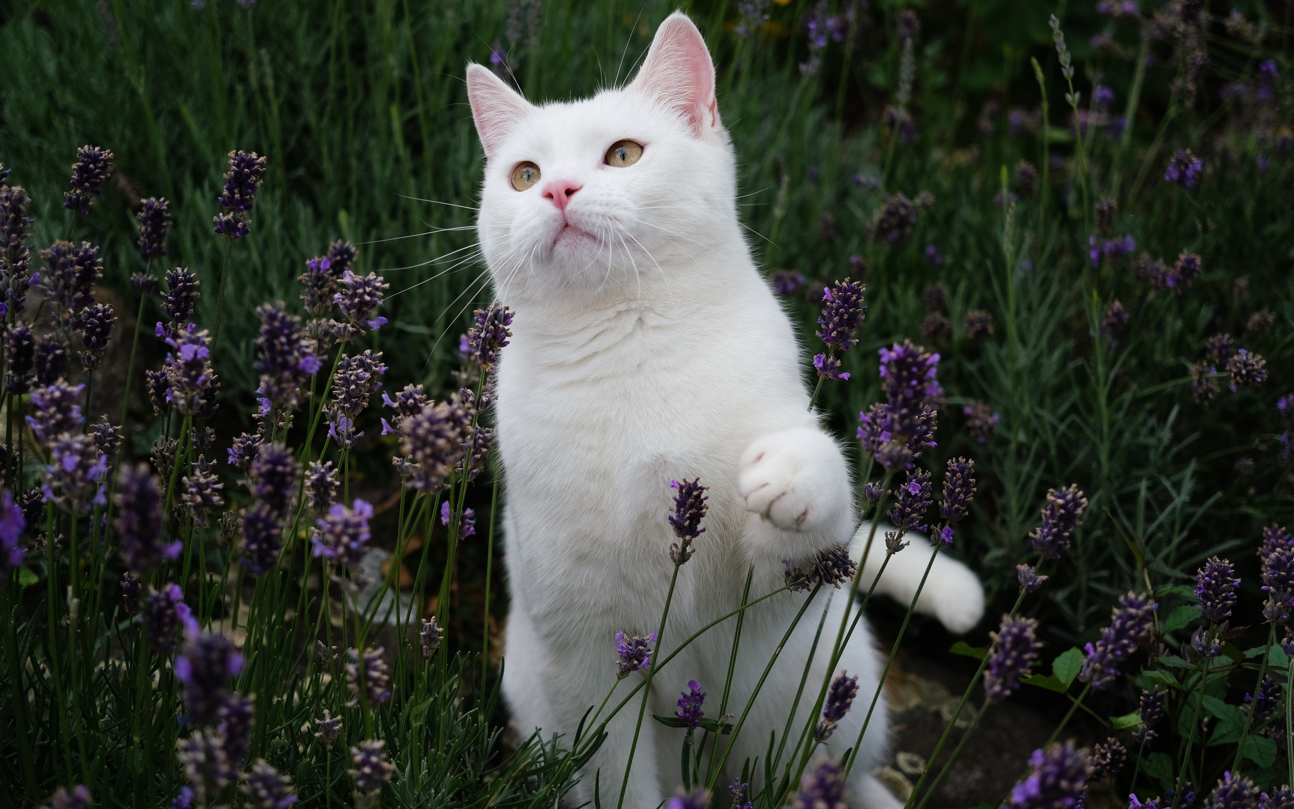 Красивый белый кот сидит в цветах лаванды Обои для рабочего стола 2560x1600