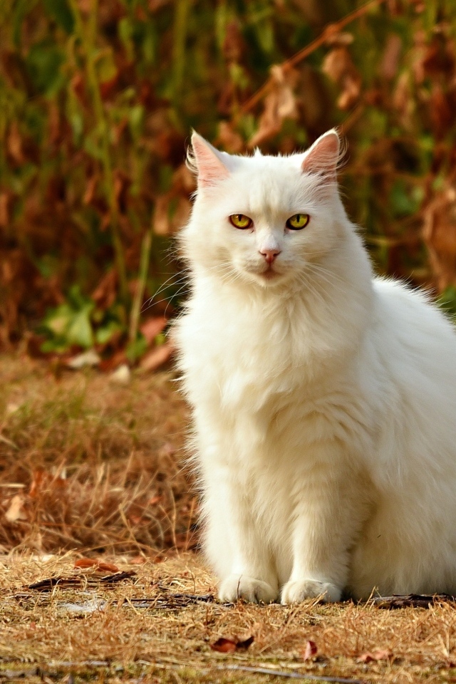 Пушистая белая кошка сидит на траве Обои для рабочего стола 640x960