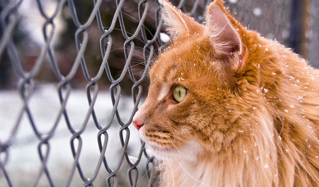 Большой рыжий кот стоит у сетки на улице зимой Обои для рабочего стола 1024x600