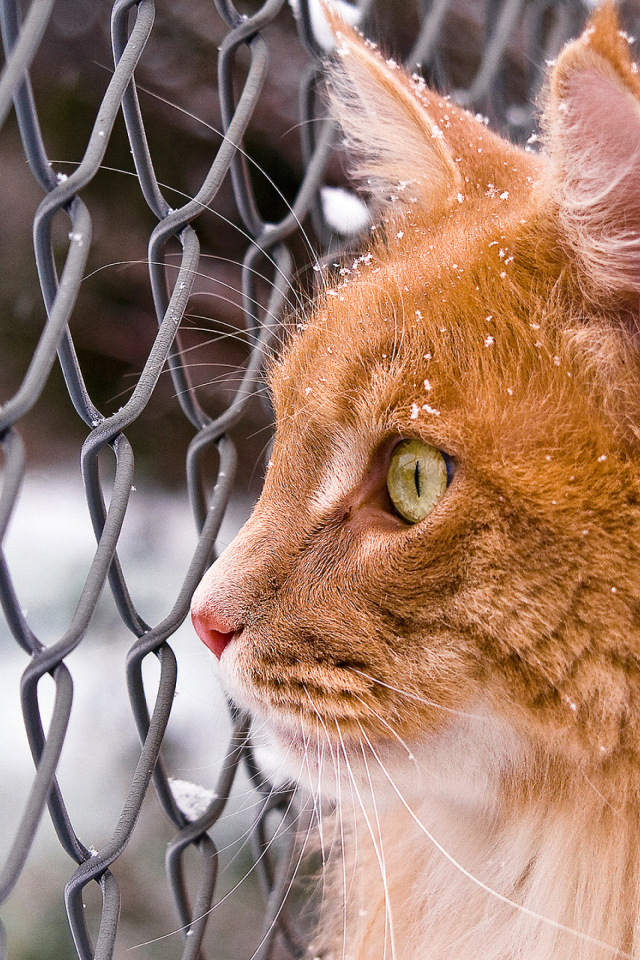 Большой рыжий кот стоит у сетки на улице зимой Обои для рабочего стола 640x960