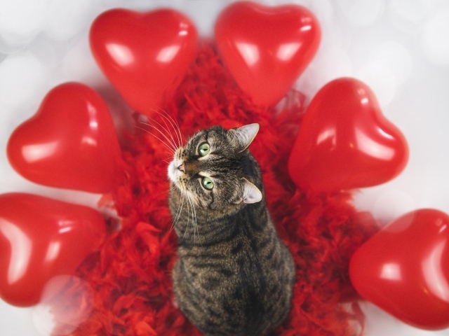 Обои: Серый кот с красными воздушными шарами в форме сердца