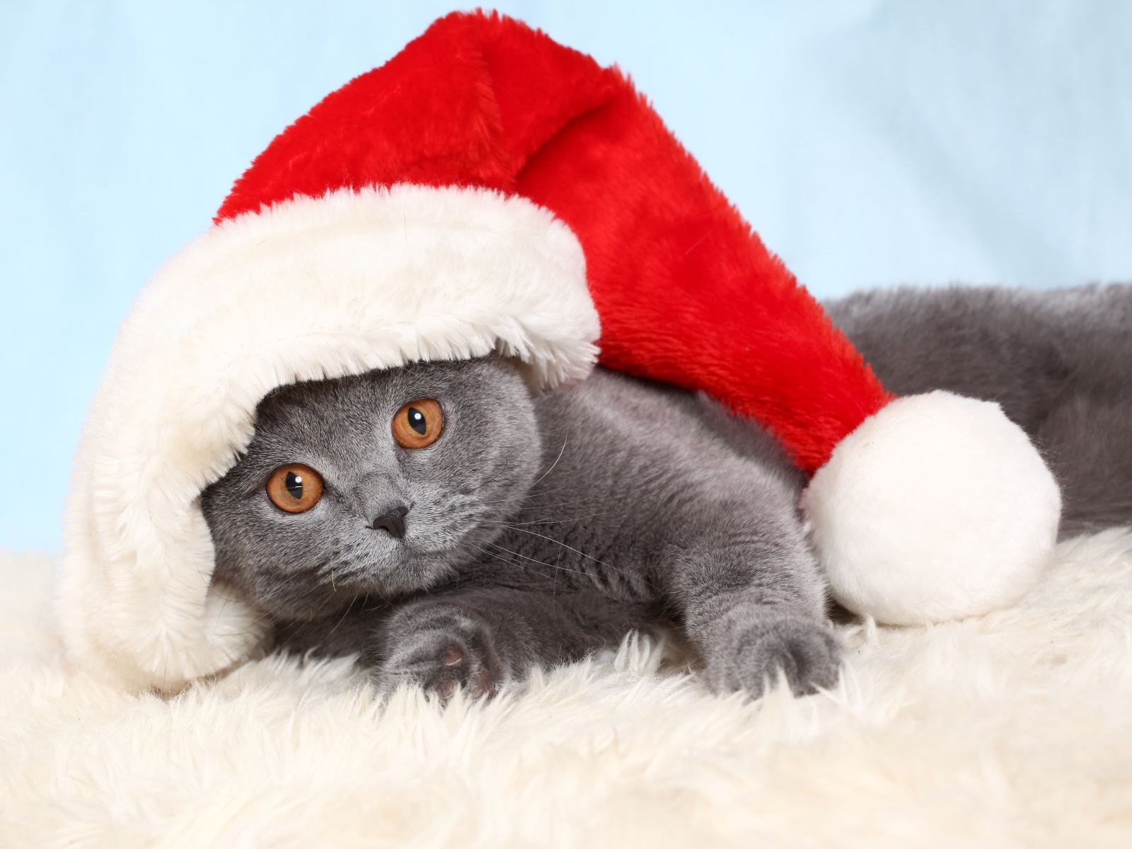Британский кот в новогодней шапке Обои для рабочего стола 1600x1200