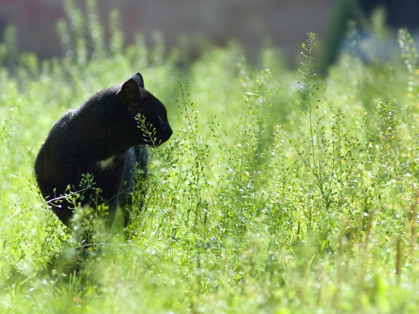 Черный кот в зеленой траве Обои для рабочего стола 1400x1050