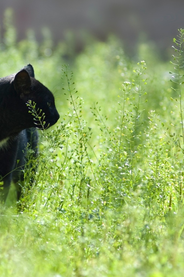 Черный кот в зеленой траве Обои для рабочего стола 640x960