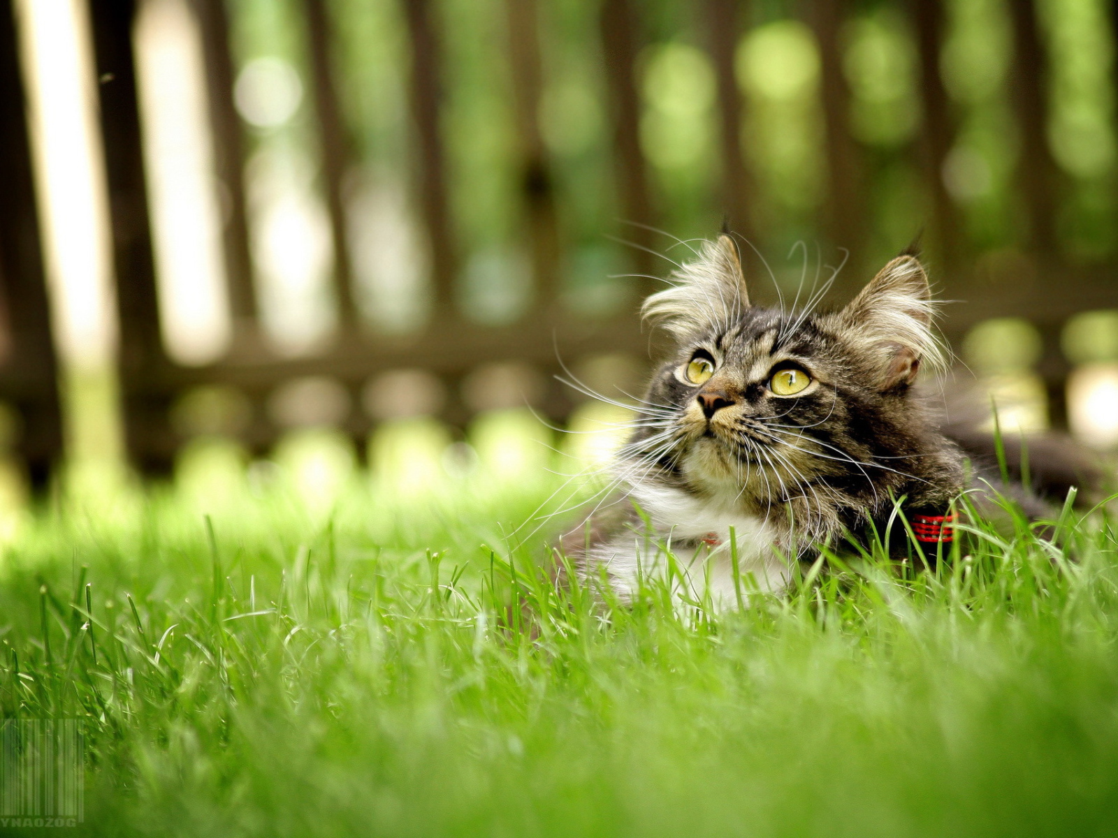 Серый кот лежит на траве Обои для рабочего стола 1600x1200