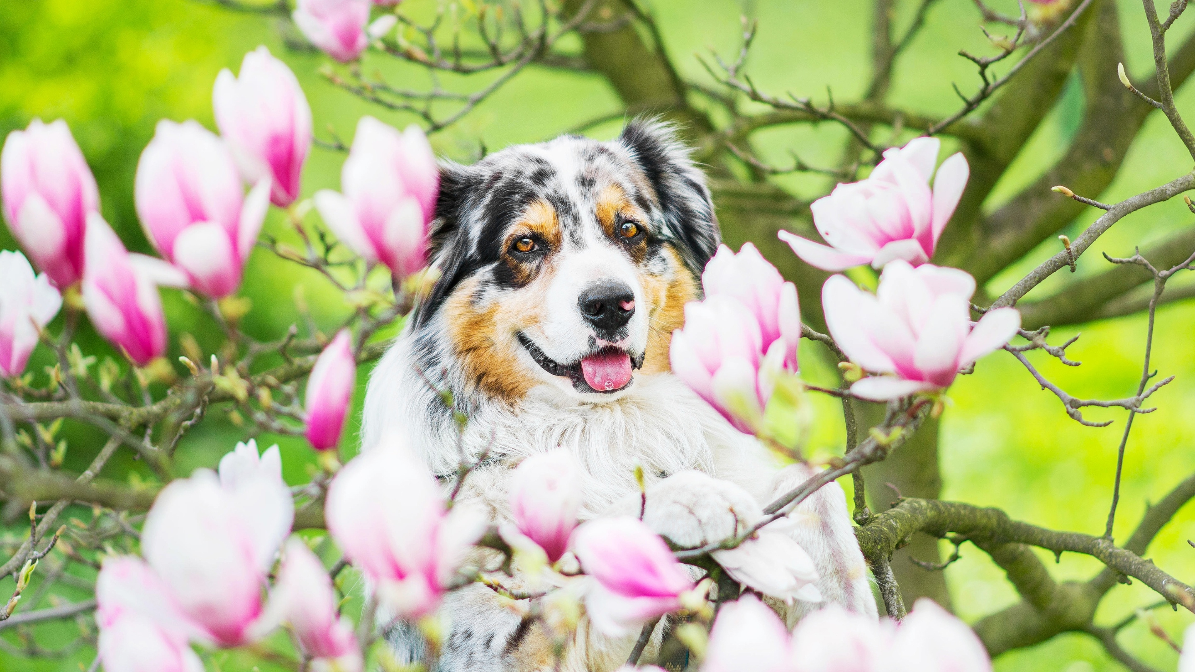Обои: Австралийская овчарка в розовых цветах магнолии