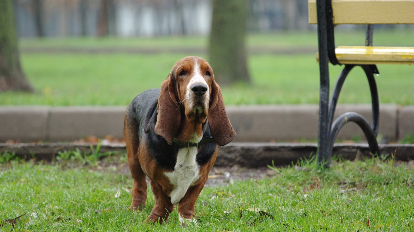 Грустная собака породы Бассет-хаунд на зеленой траве - 1920x1200