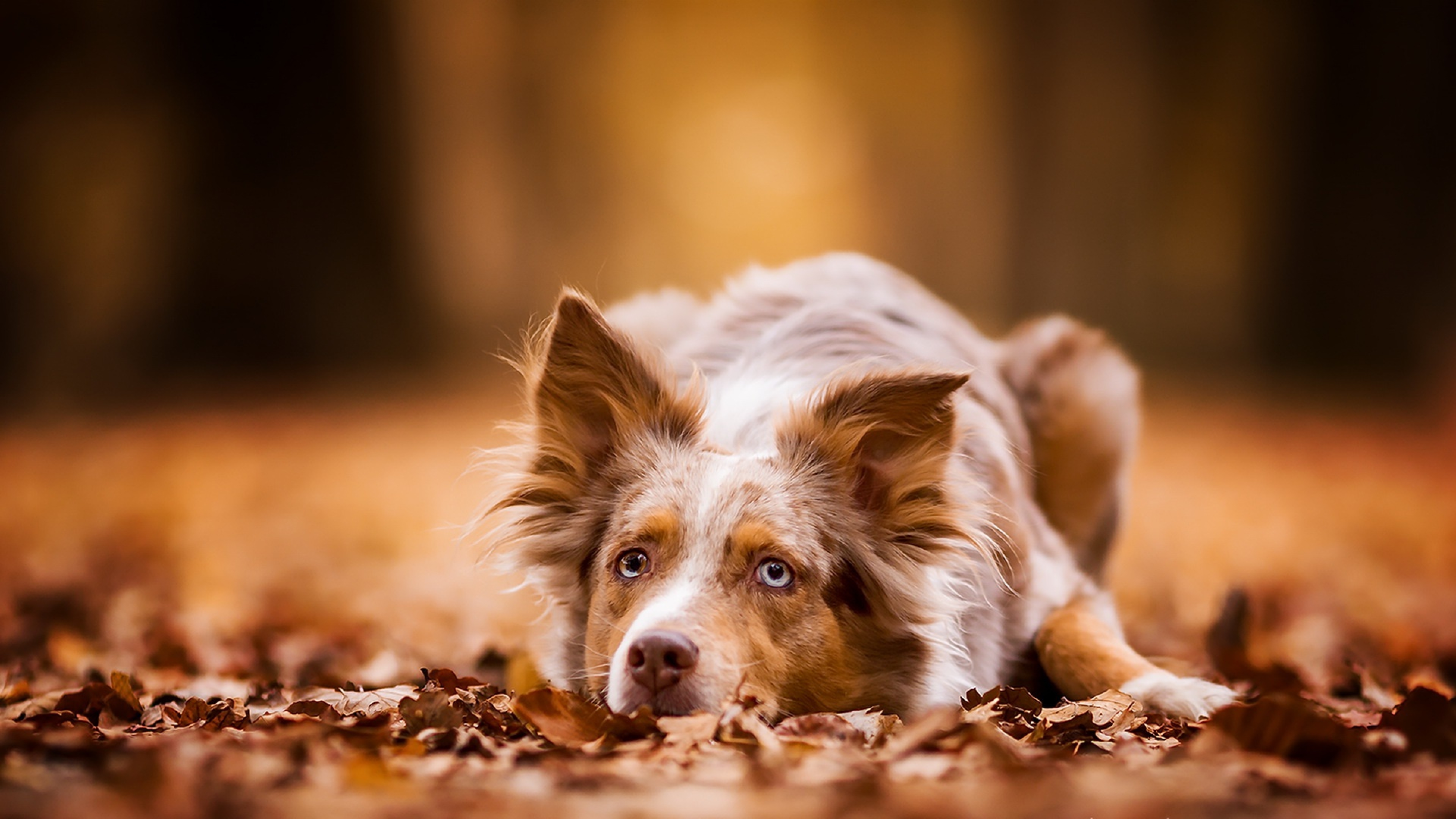 Обои: Голубоглазая рыжая собака лежит на сухой листве