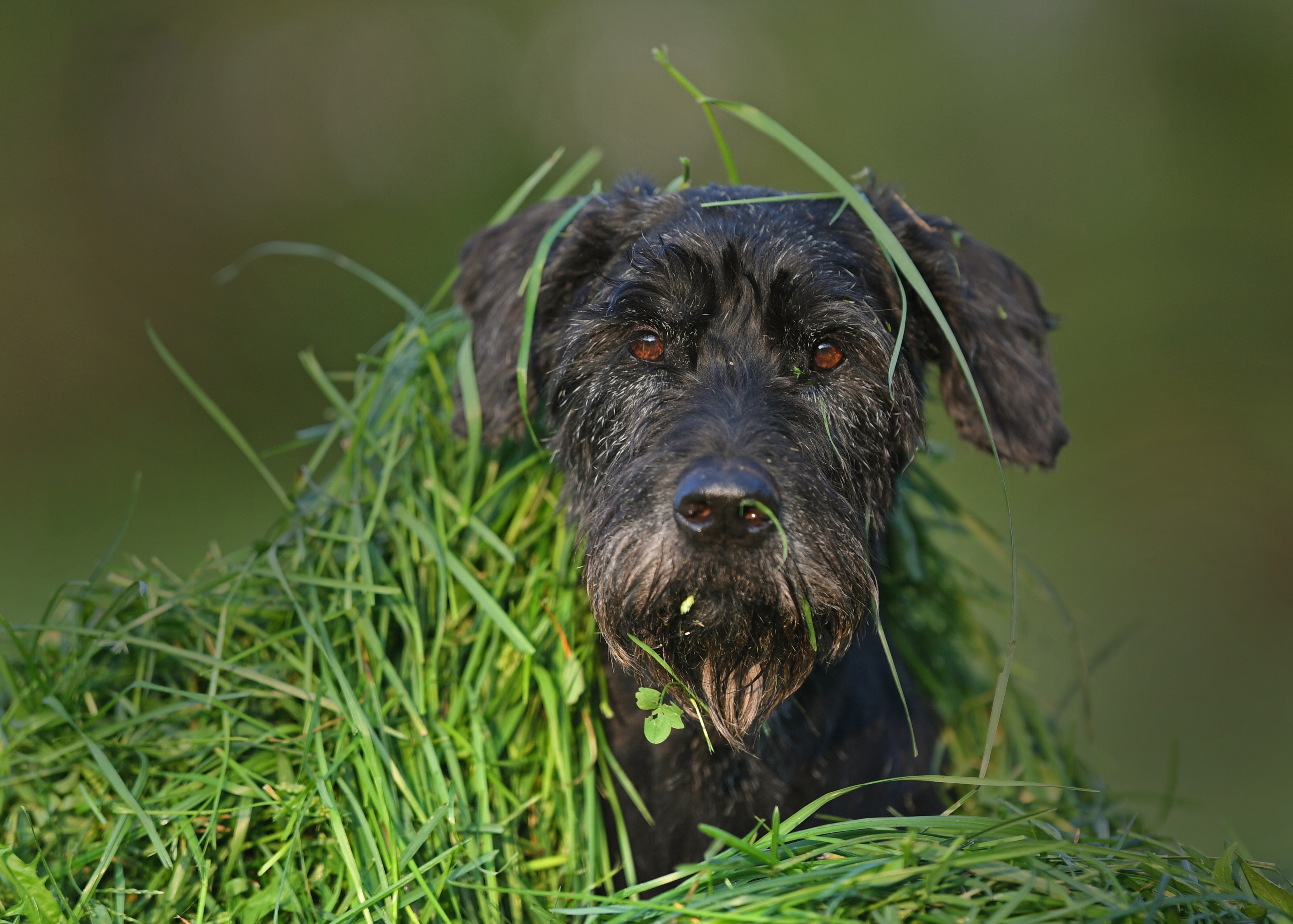 Черная собака породы Шнауцер сидит в зеленой траве - 4430x3165
