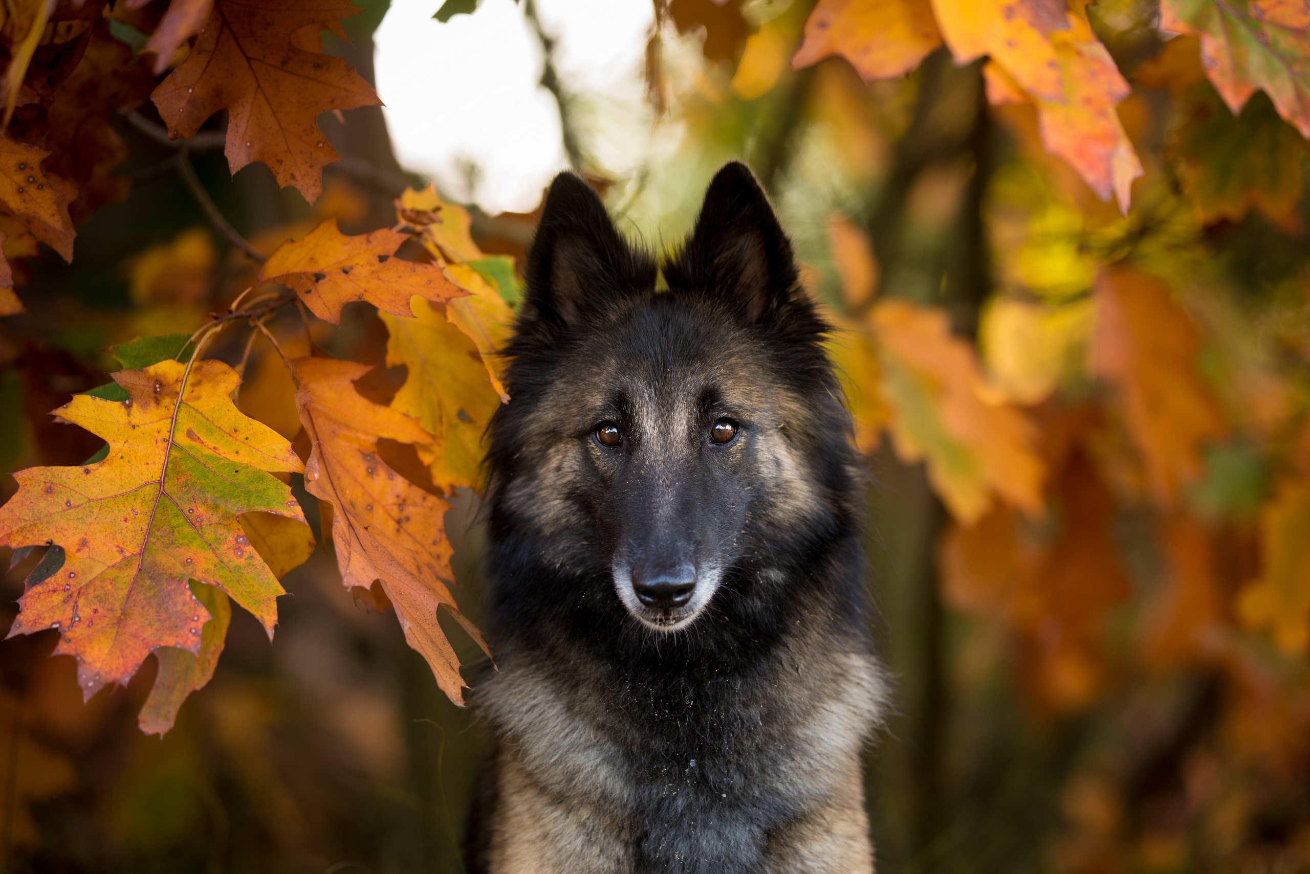 Собака в желтых осенних дубовых листьях - 2560x1709