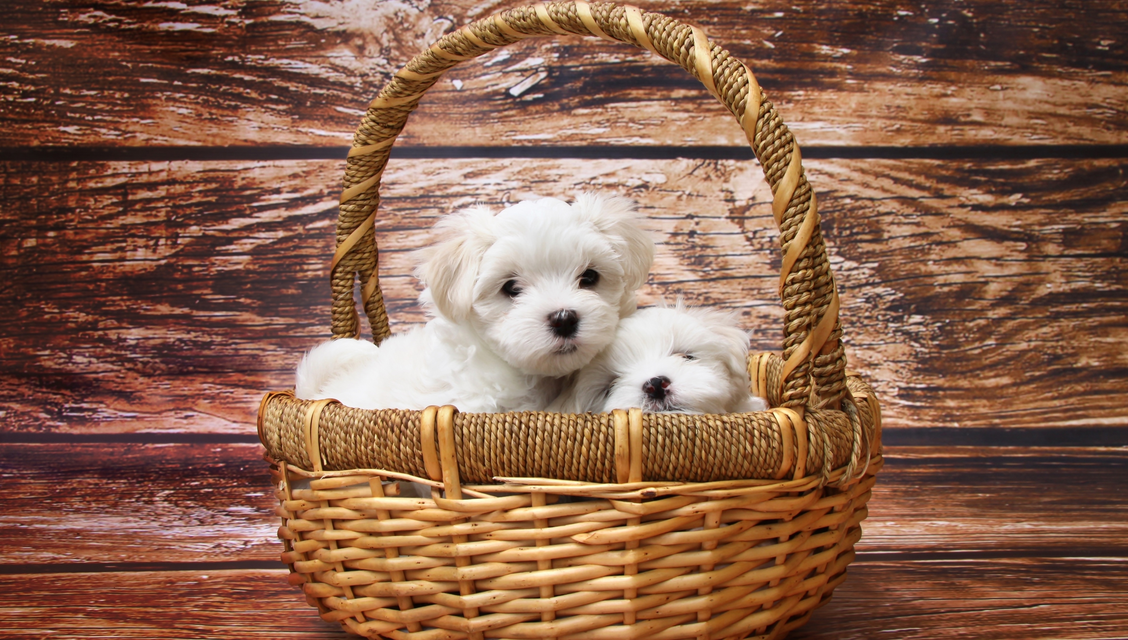 Маленькие белые щенки болонки в корзине - 3808x2160