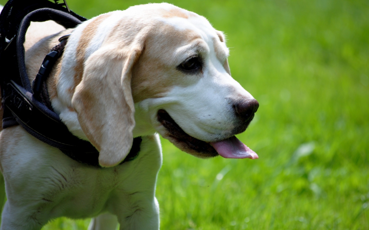 Пес поводырь породы бигль с высунутым языком Обои для рабочего стола 1280x800