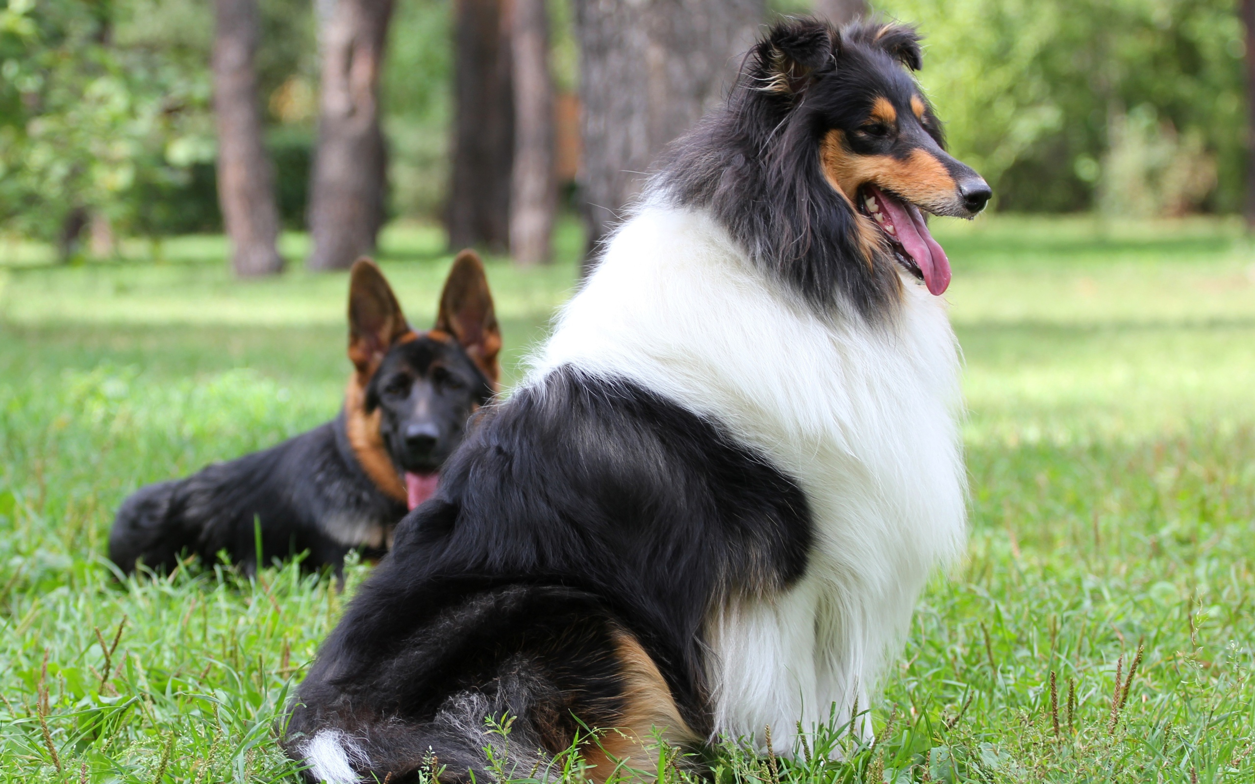 Немецкая овчарка и колли лежат на зеленой траве - 4341x3279