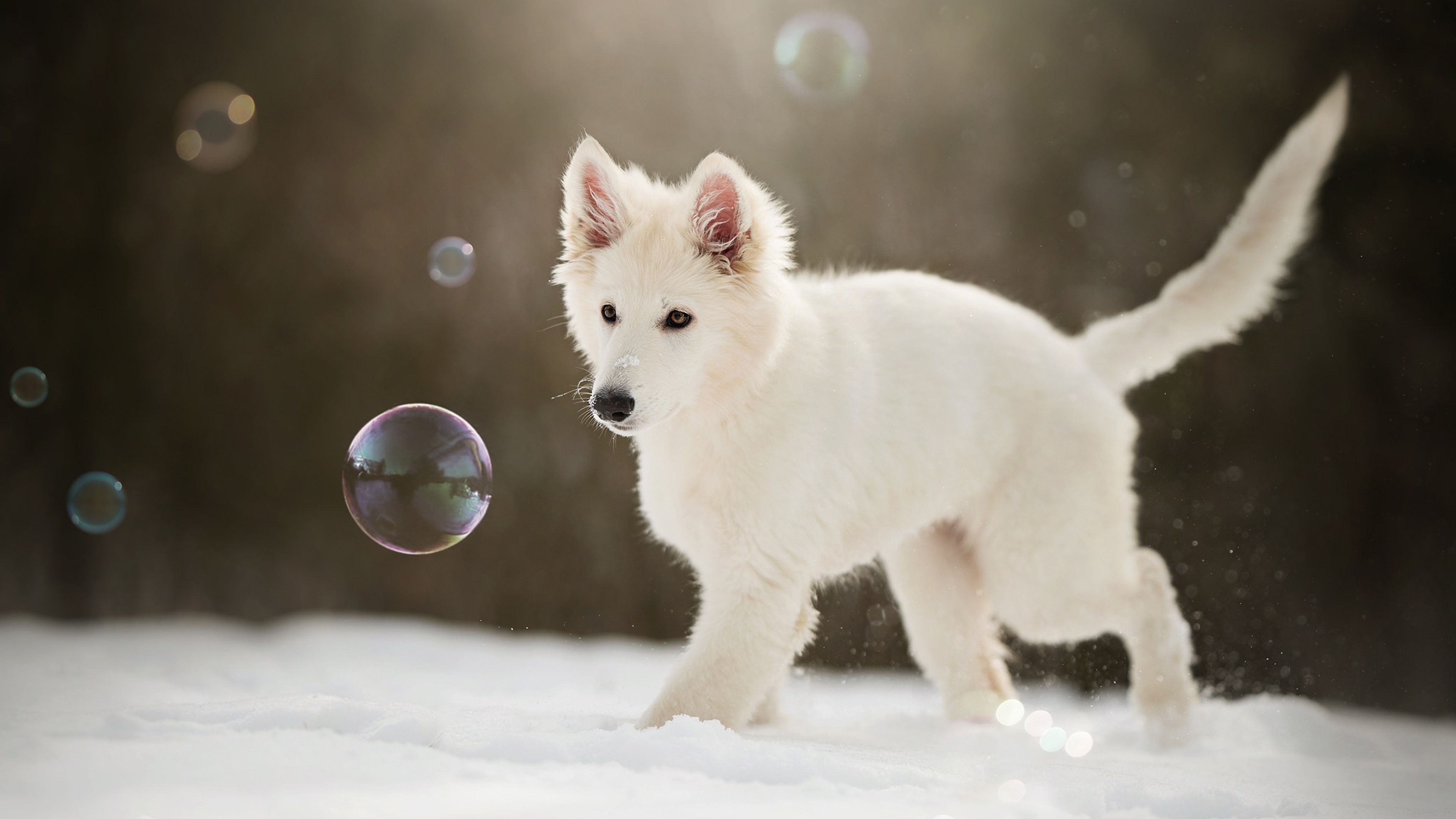 Обои: Белая швейцарская овчарка ловит мыльные пузыри