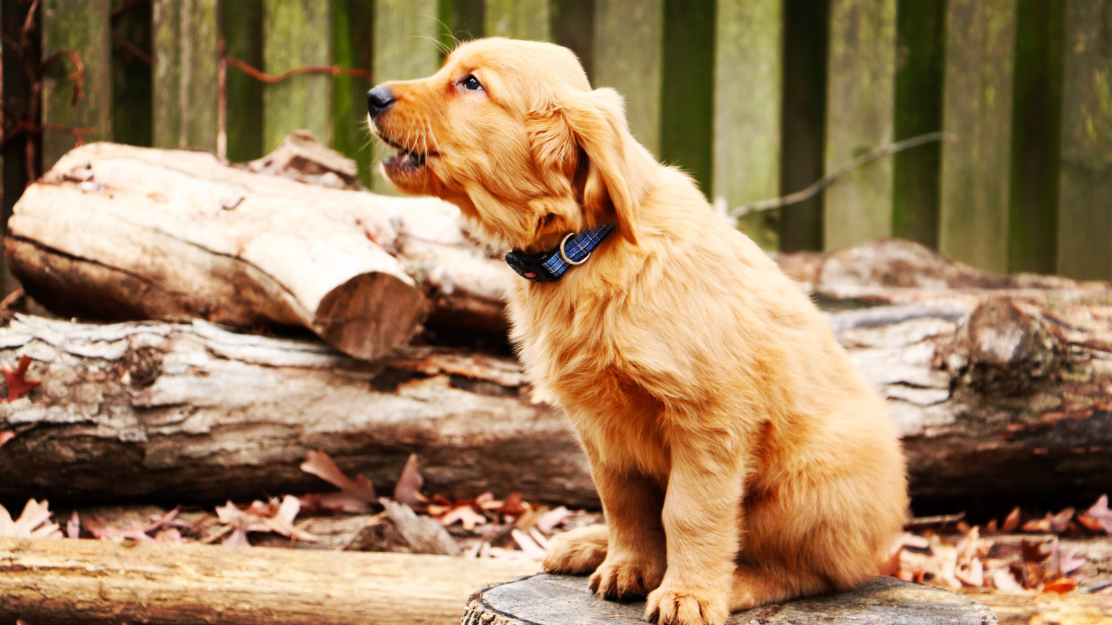 Маленький золотистый ретривер сидит на пне Обои для рабочего стола 1600x900