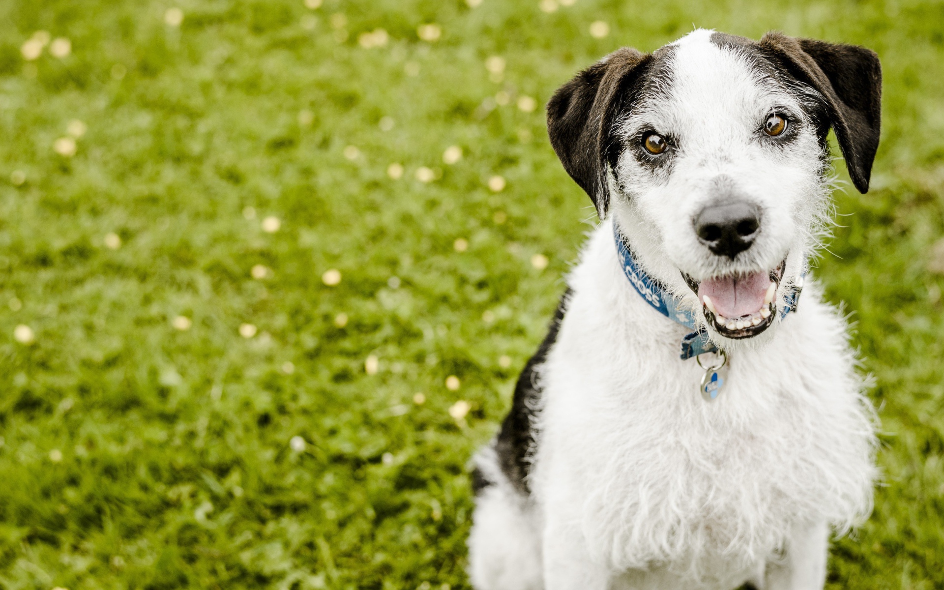Пес с высунутым языком сидит на зеленой траве - 3840x2160