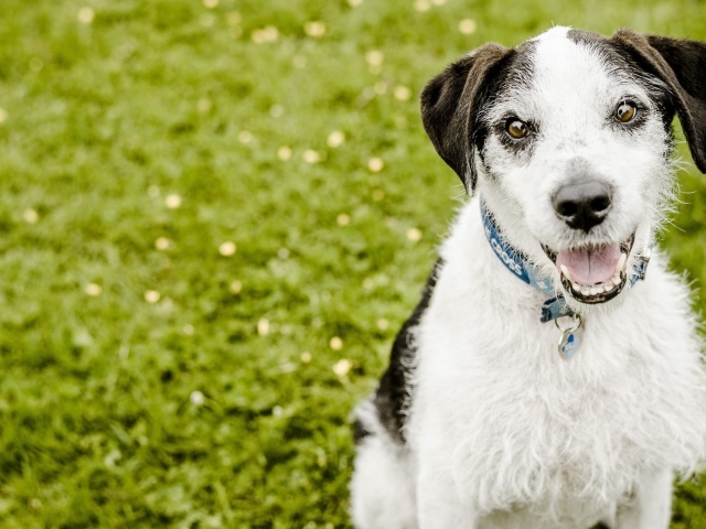 Обои: Пес с высунутым языком сидит на зеленой траве