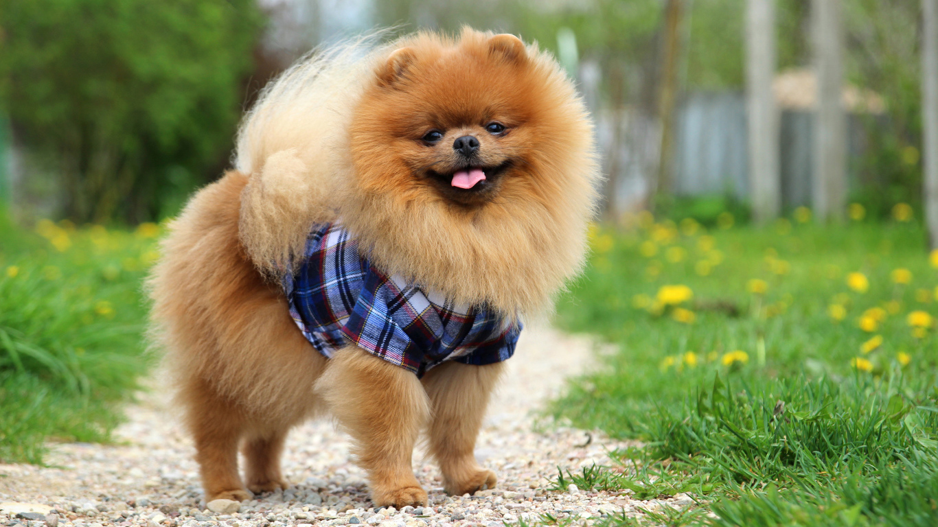 Смешной пушистый шпиц в рубашке Обои для рабочего стола 1366x768