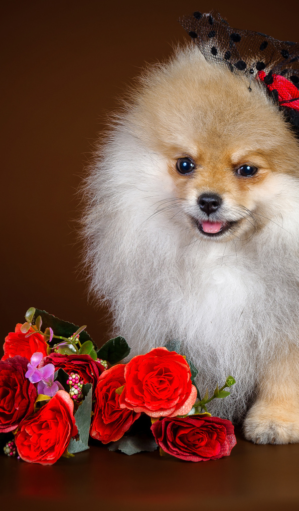 Милый шпиц в шляпке с букетом Обои для рабочего стола 600x1024