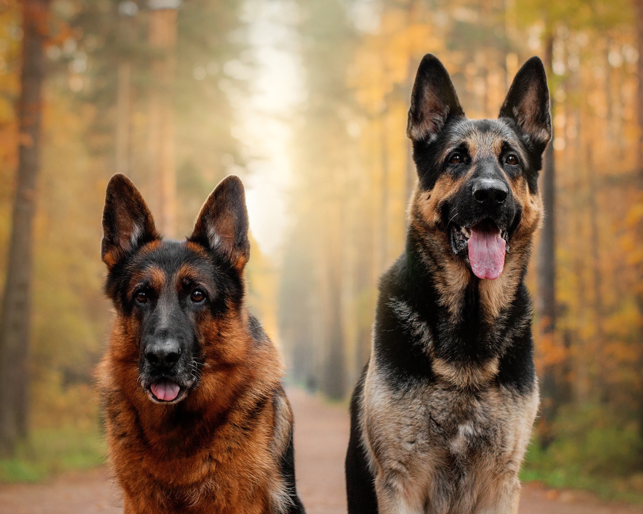 Две красивые немецкие овчарки с высунутым языком в лесу Обои для рабочего стола 1280x1024
