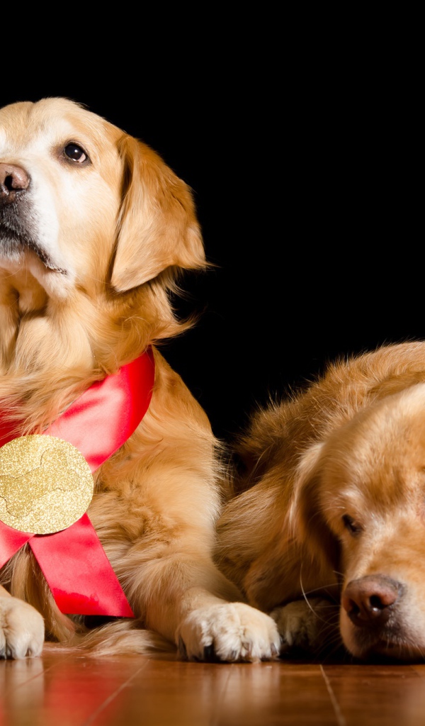 Два золотистых ретривера на полу на черном фоне Обои для рабочего стола 600x1024