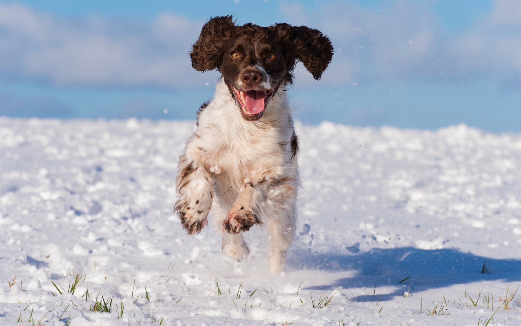 Довольный спаниель бежит по снегу Обои для рабочего стола 1680x1050
