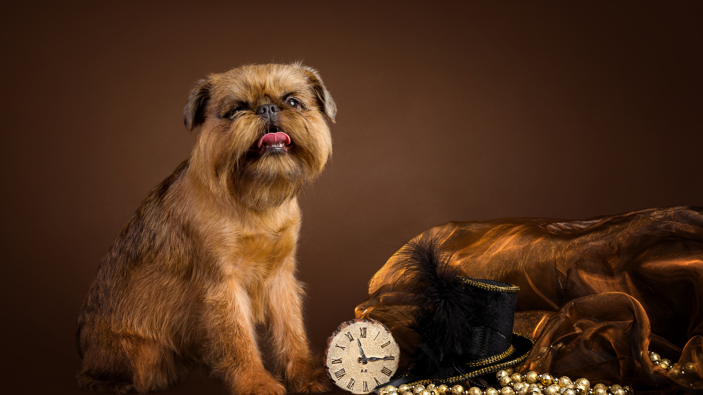 Собака породы Бельгийский гриффон с часами и шляпой на коричневом фоне - 4050x2700