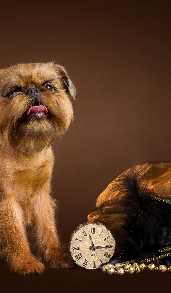 Собака породы Бельгийский гриффон с часами и шляпой на коричневом фоне Обои для рабочего стола 600x1024