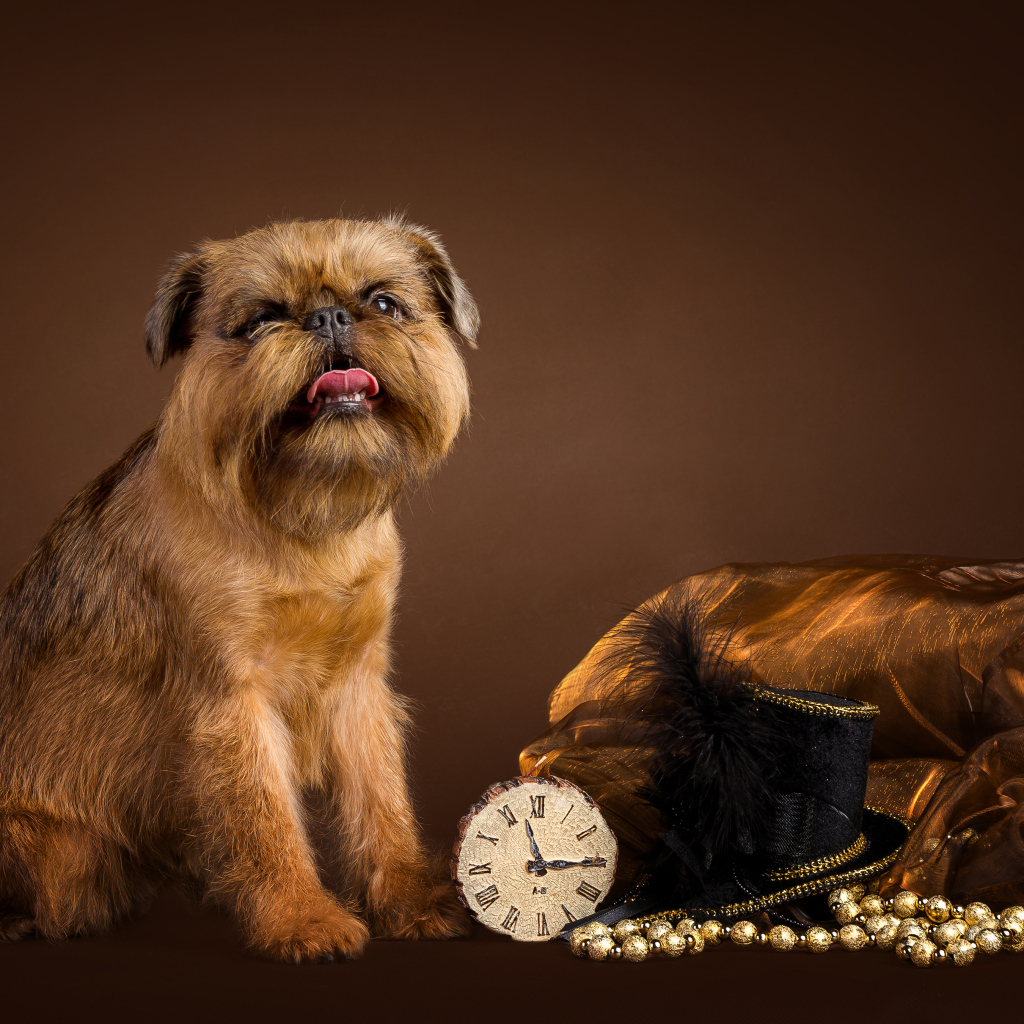 Собака породы Бельгийский гриффон с часами и шляпой на коричневом фоне - 4050x2700
