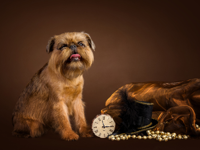 Обои: Собака породы Бельгийский гриффон с часами и шляпой на коричневом фоне