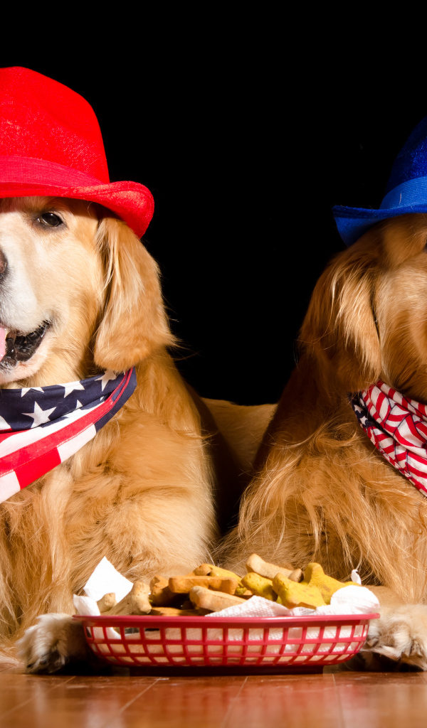 Два золотистых ретривера в шляпах на черном фоне Обои для рабочего стола 600x1024