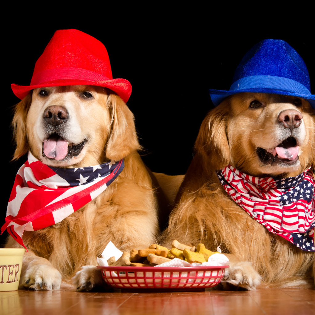 Два золотистых ретривера в шляпах на черном фоне Обои для рабочего стола 1024x1024