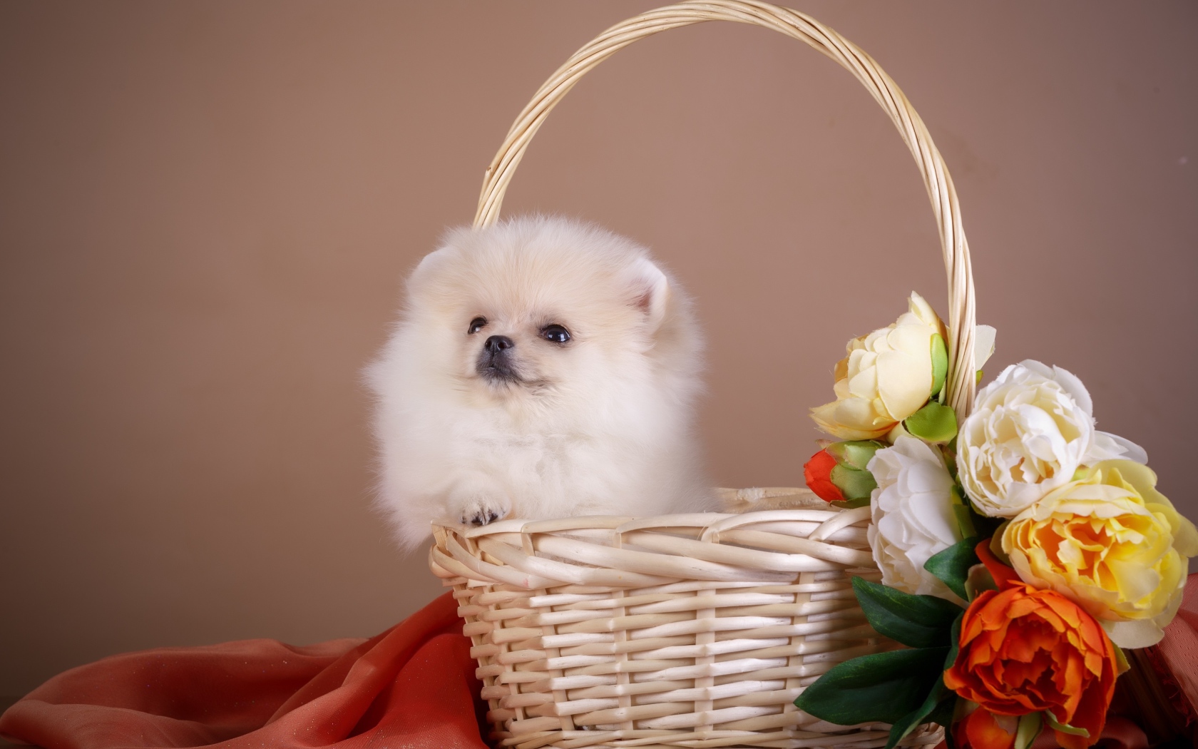 Маленький шпиц сидит в корзине с цветами Обои для рабочего стола 1680x1050