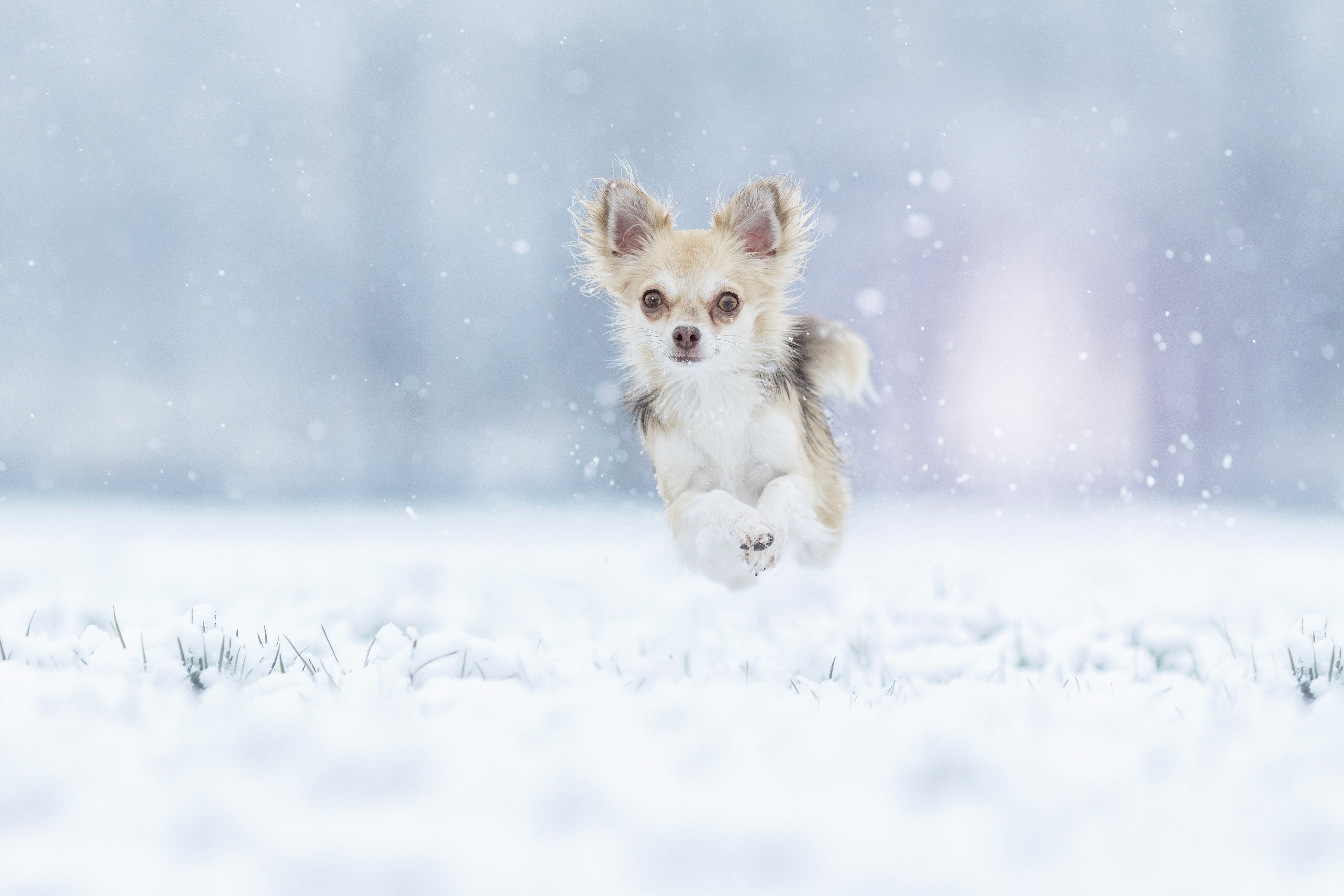 Собака породы чихуахуа бежит по заснеженной земле - 5472x3648