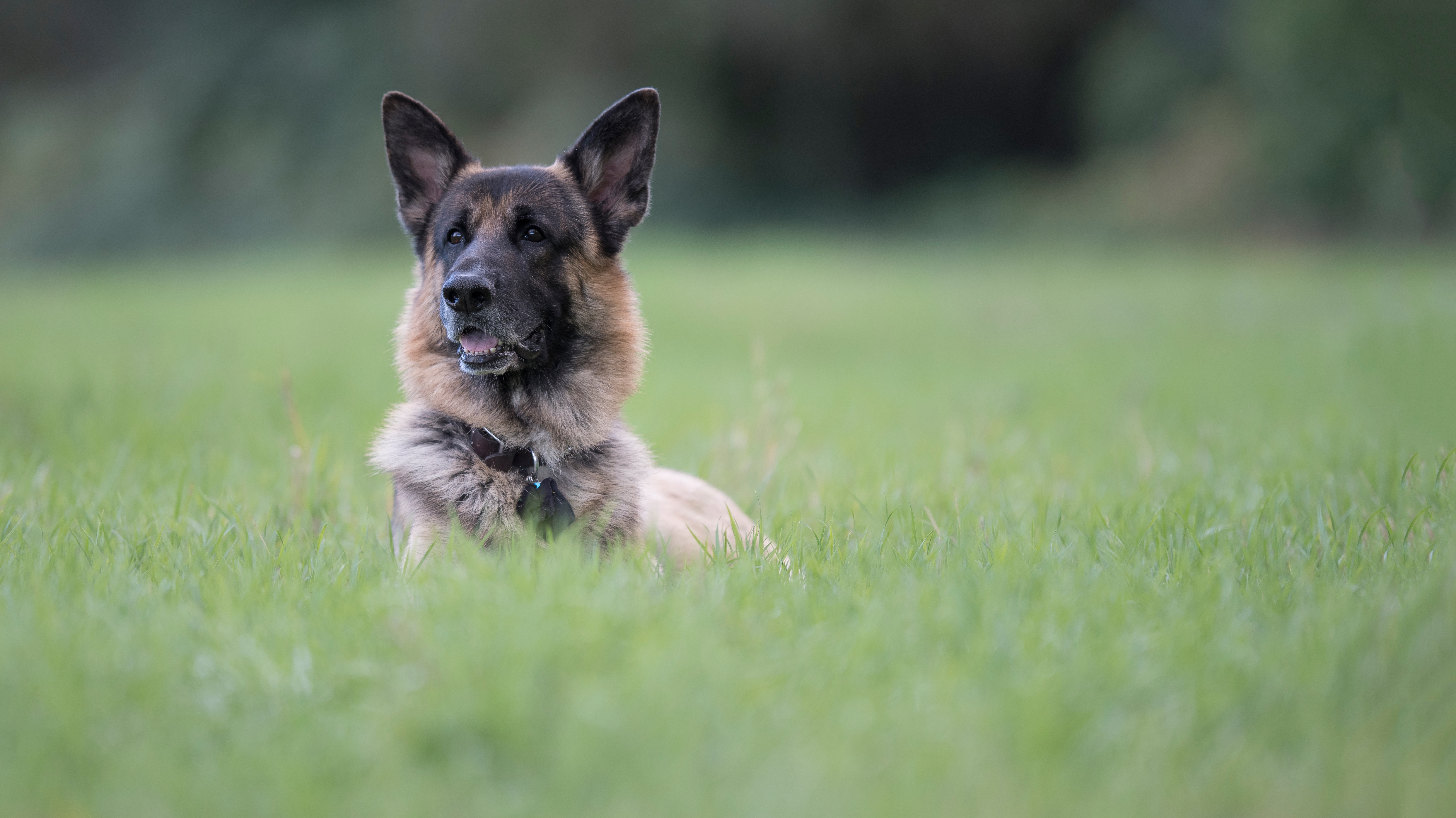 Немецкая овчарка отдыхает в зеленой траве - 6677x3756