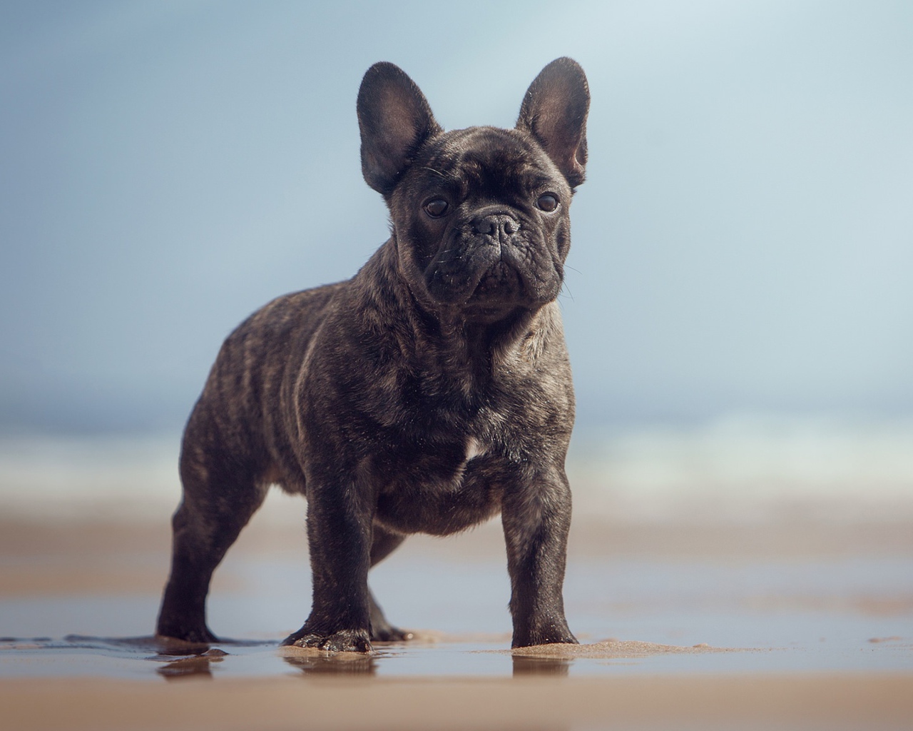 Черный французский бульдог стоит на мокром песке - 3840x2160