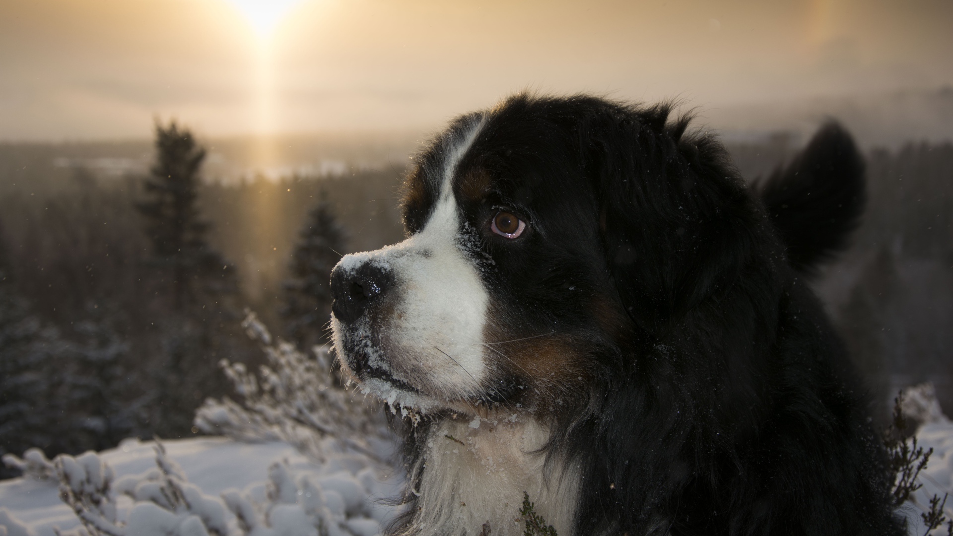 Бернский зенненхунд в заснеженном лесу на закате Обои для рабочего стола 1920x1080