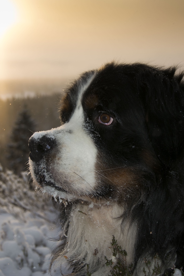 Бернский зенненхунд в заснеженном лесу на закате Обои для рабочего стола 640x960