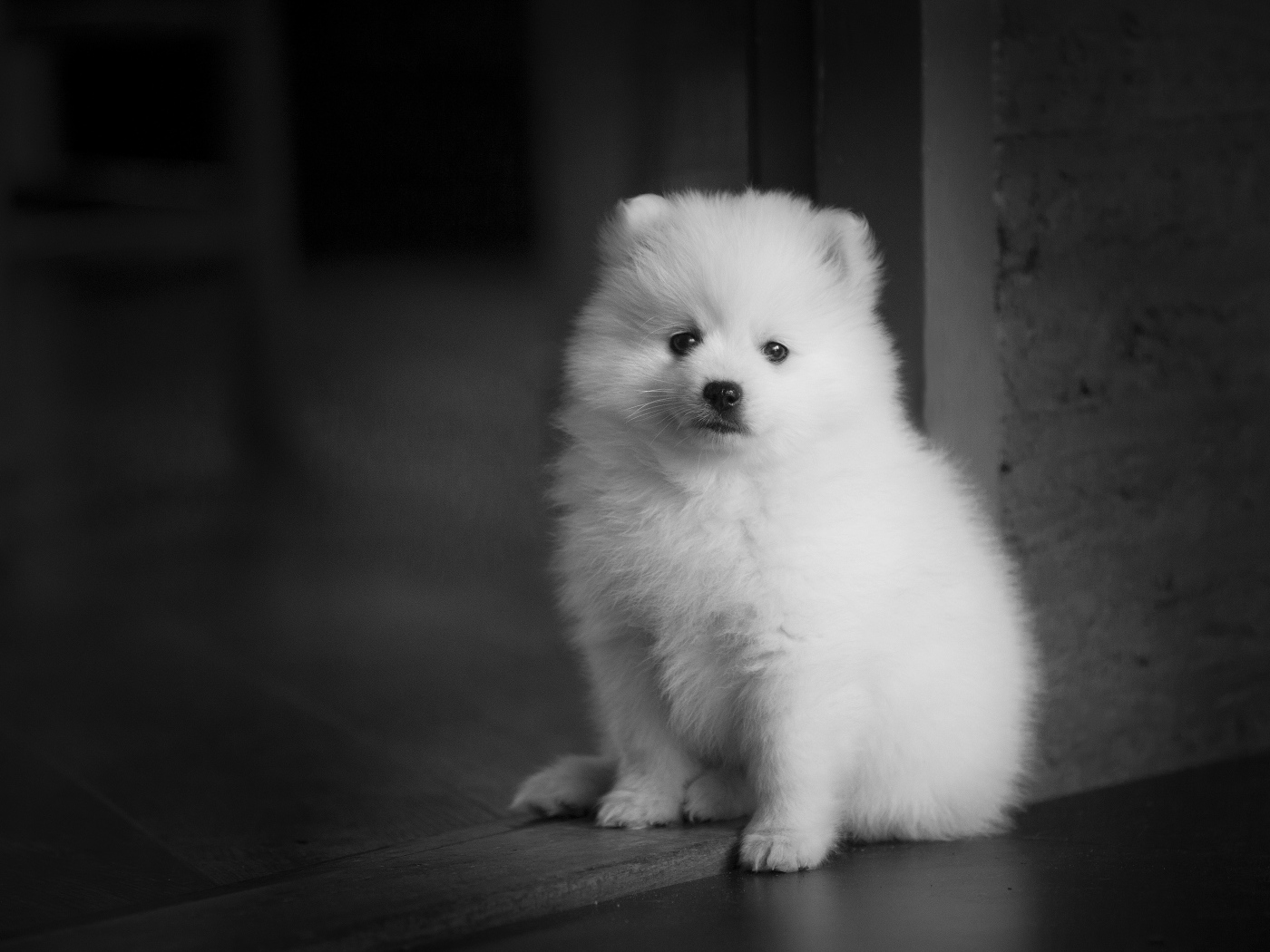 Маленький белый щенок шпица у двери Обои для рабочего стола 1400x1050