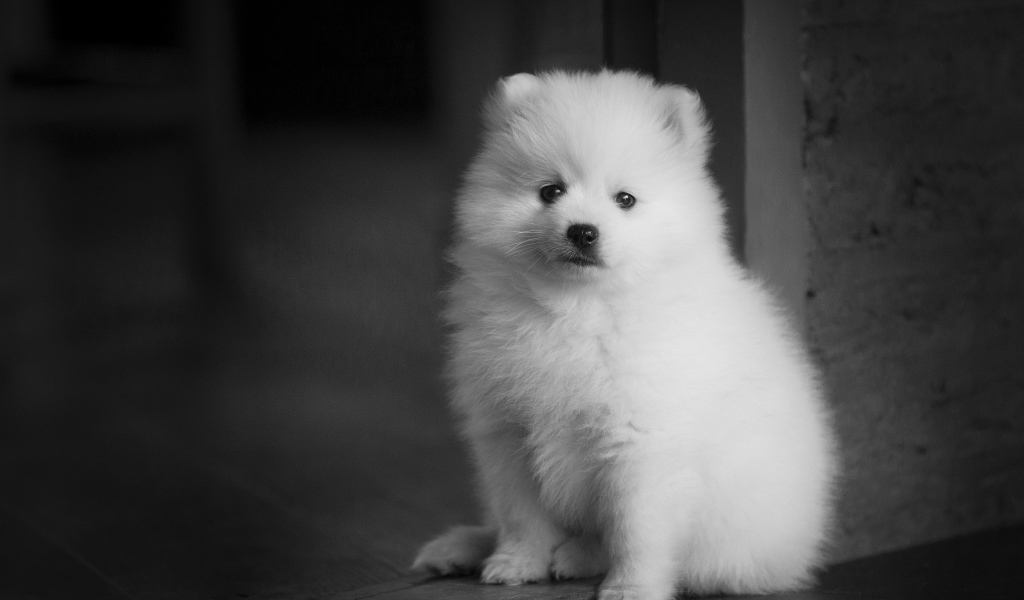 Маленький белый щенок шпица у двери Обои для рабочего стола 1024x600
