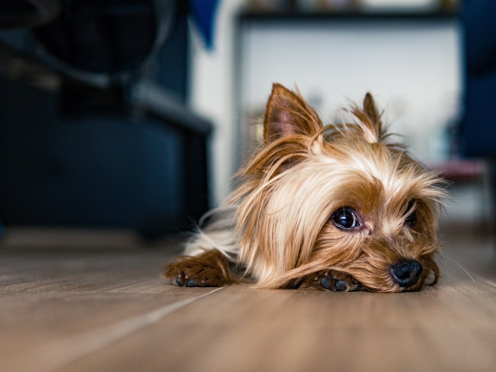Грустный йоркширский терьер на полу Обои для рабочего стола 1600x1200
