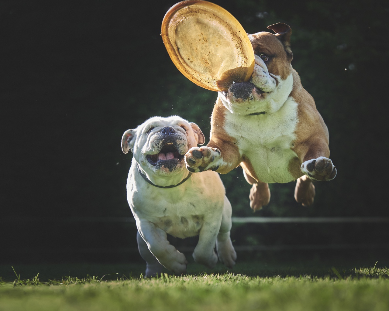 Два английских бульдога играют с летающей тарелкой - 5301x2982