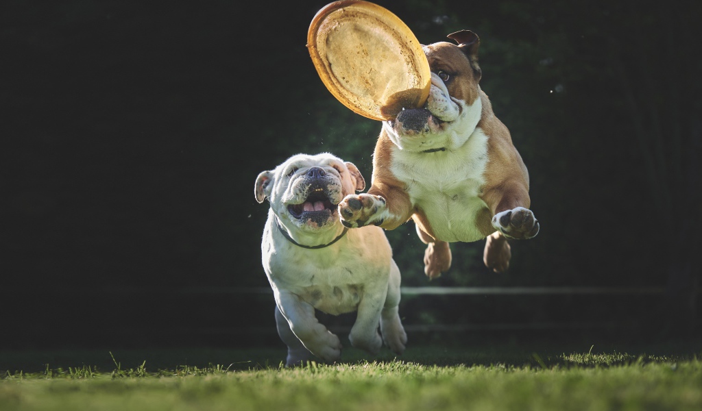 Два английских бульдога играют с летающей тарелкой Обои для рабочего стола 1024x600