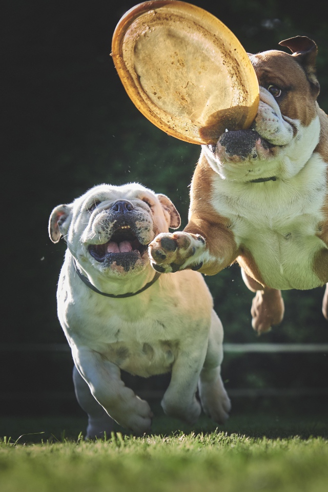 Два английских бульдога играют с летающей тарелкой - 5301x2982