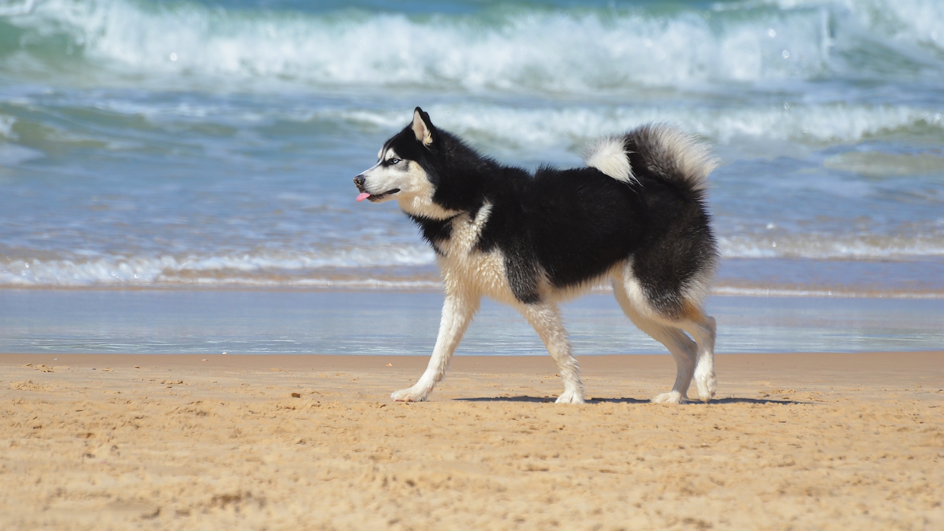 Собака хаски бежит по песку на пляже Обои для рабочего стола 1920x1080
