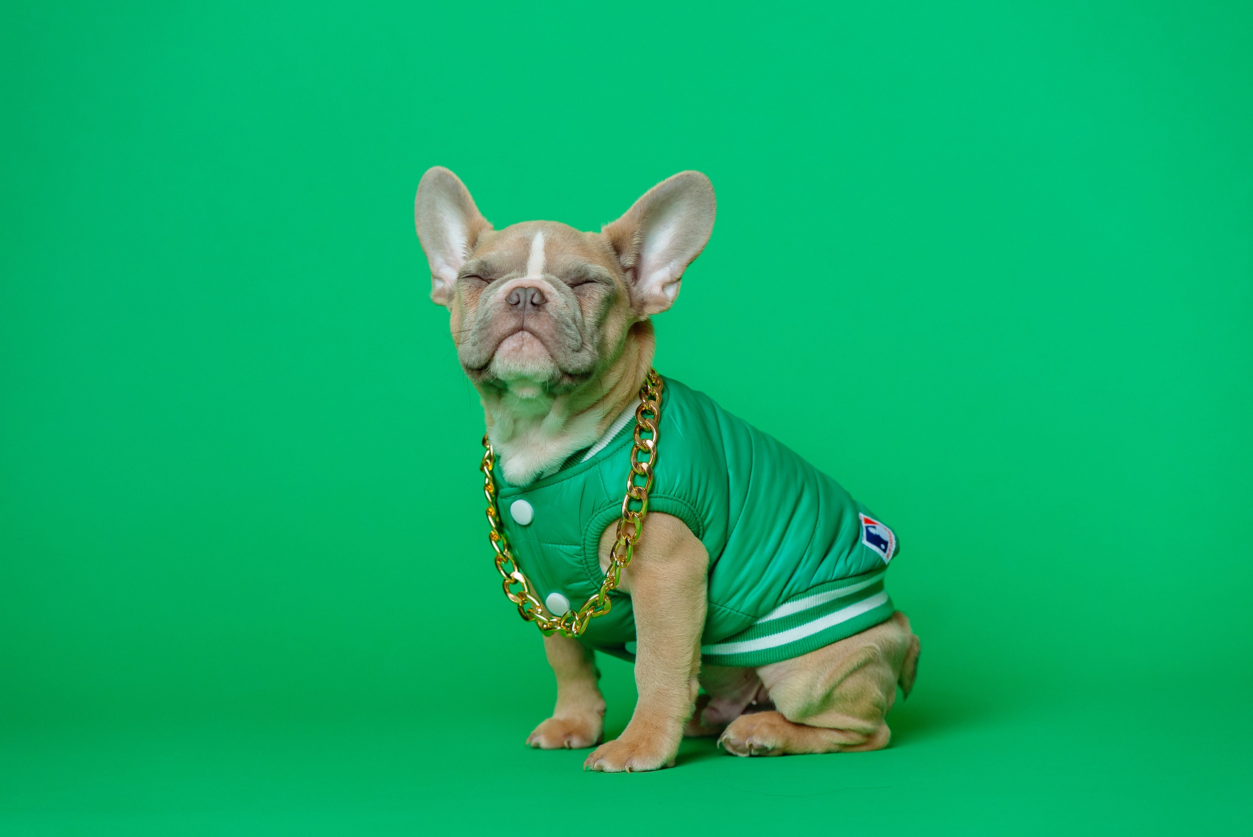 Улыбающийся французский бульдог на зеленом фоне - 4164x2781