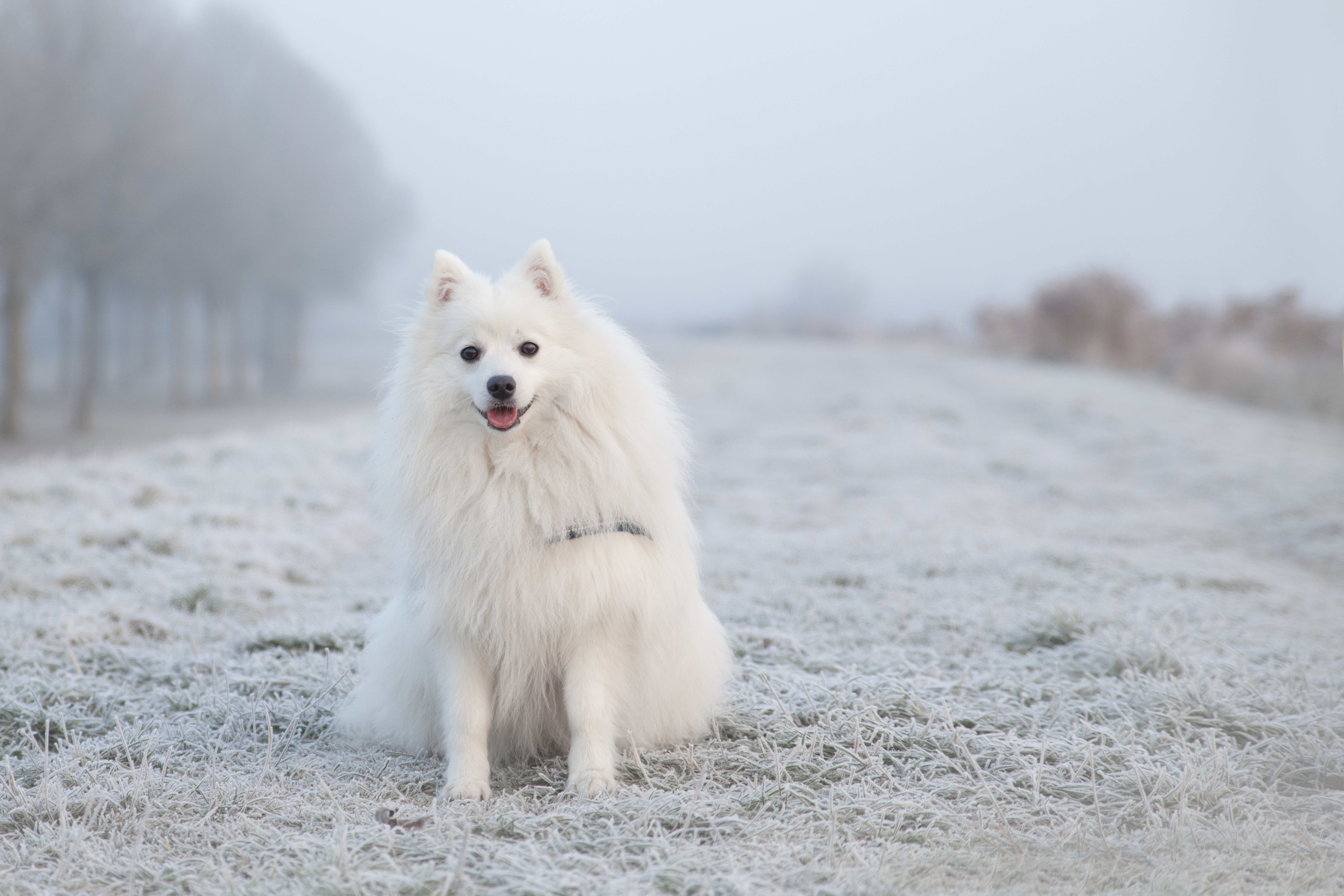 Белый пушистый шпиц сидит на покрытой инеем траве - 9000x6000